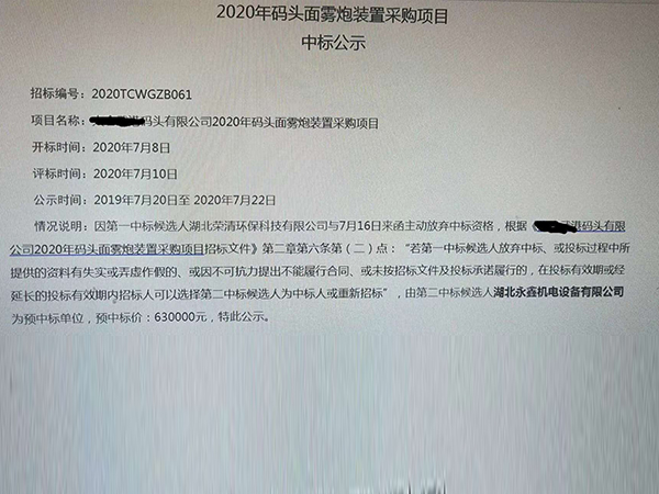 湖北永鑫機電設備有限公司《霧炮中標公示》